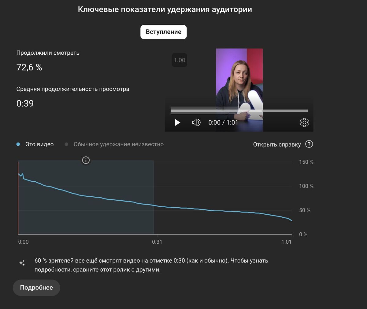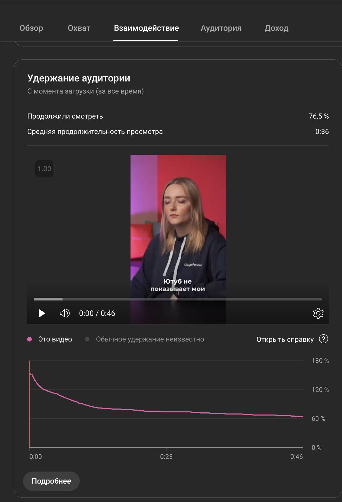 Посмотреть данные об удержании вы можете в аналитике каждого отдельного короткого видео во вкладке «Обзор» или «Взаимодействие»: здесь можно оценить и процент удержания, и среднее время просмотра, а также и то, как именно зрители смотрят Шортс.