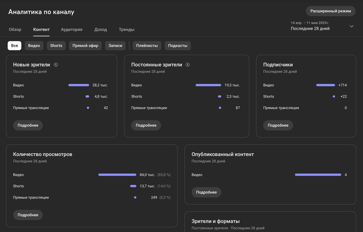 Всё это, по сути, просто суммирует такие данные, как количество показов и количество реальных просмотров ваших Шортс.